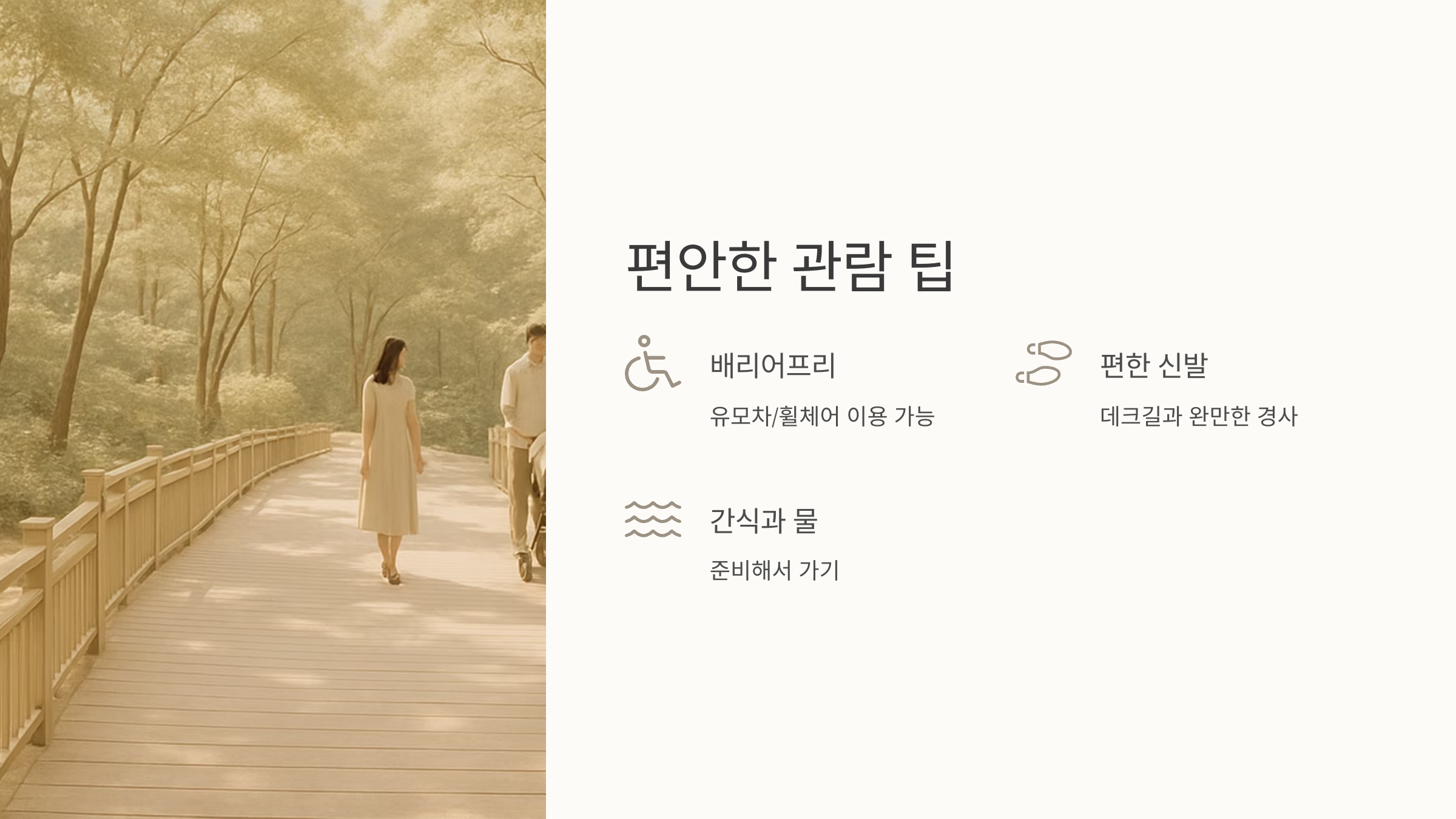 화담숲은 유모차나 휠체어를 이용해도 편하게 다닐 수 있도록 잘 정비되어 있어요. 완만한 경사와 데크길 덕분에 가족 단위 방문객이나 어르신들도 부담 없이 산책을 즐길 수 있답니다.