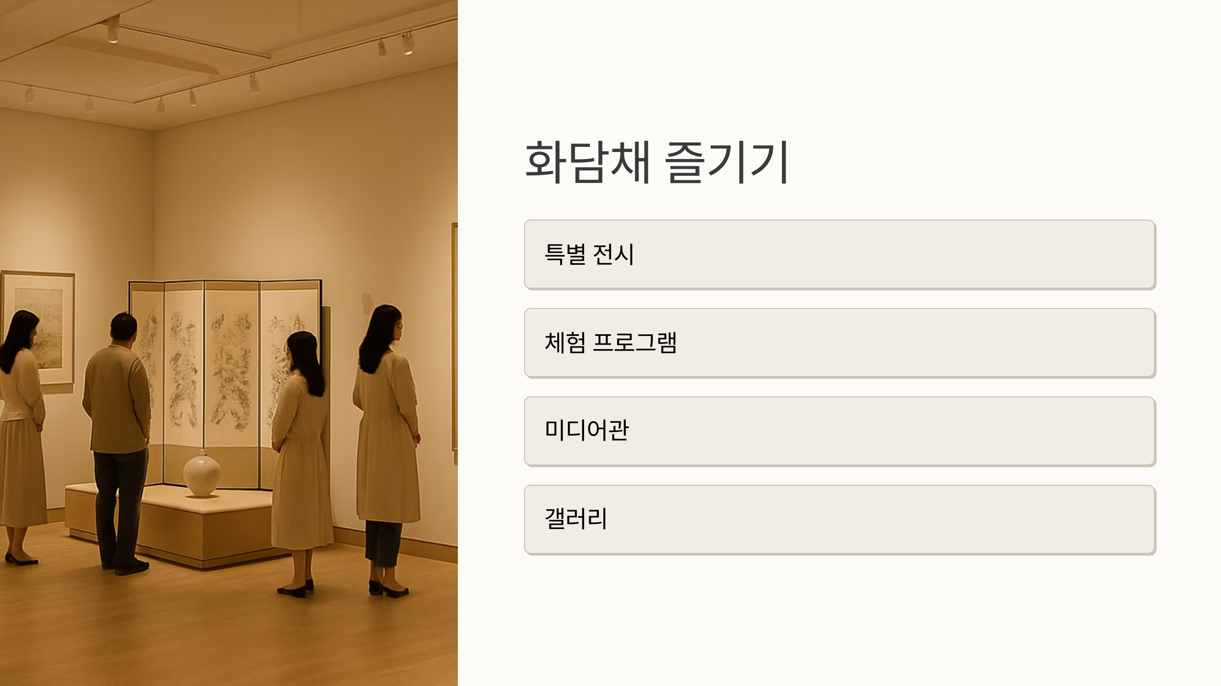 하지만 미디어관이나 갤러리는 운영 상황에 따라 달라질 수 있으니, 홈페이지를 꼭 참고해 주세요. 모노레일과 화담채를 통해 다채로운 즐거움을 더해보세요. 다양한 즐길거리들이 여러분의 화담숲 여행을 더욱 풍성하게 만들어줄 거예요.